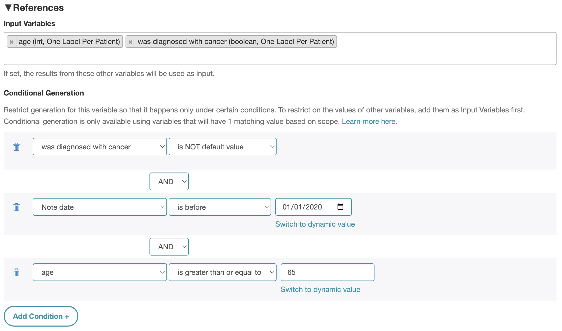 You’ll find this in the Edit Variable screen under References > Conditional Generation. More about how to use conditional generation here.