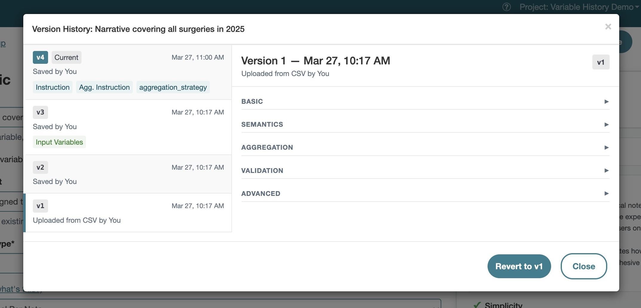 The Variable History feature in Brim lets you track changes to a variable over time and revert to previous versions when needed. This makes it easy to experiment, collaborate, and modify variables with confidence.